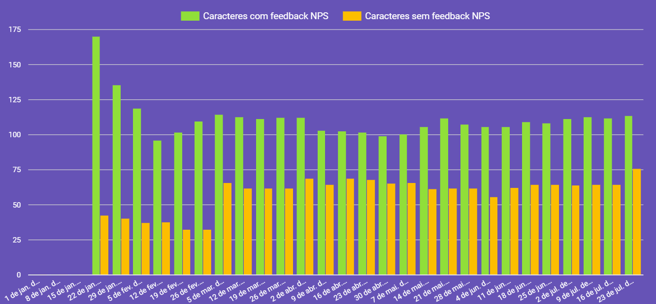 Caracteres com feedback NPS: Representa a quantidade média de caracteres fornecidos no feedback da respostas das pesquisas quando o recurso de assistente de feedbacks está ativado.