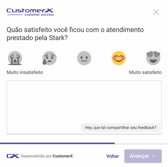 Nenhum texto informado: Se o respondente não inserir nenhum texto de feedback, o Assistente mostrará a mensagem: "Hey, que tal compartilhar seu feedback?"