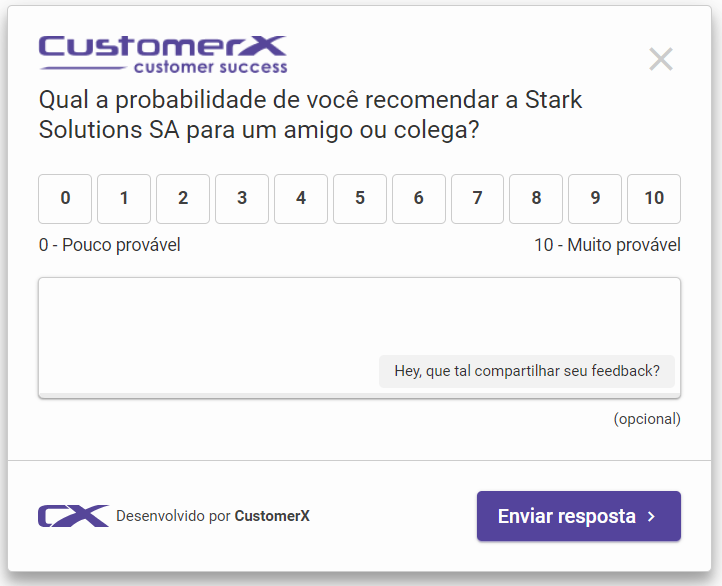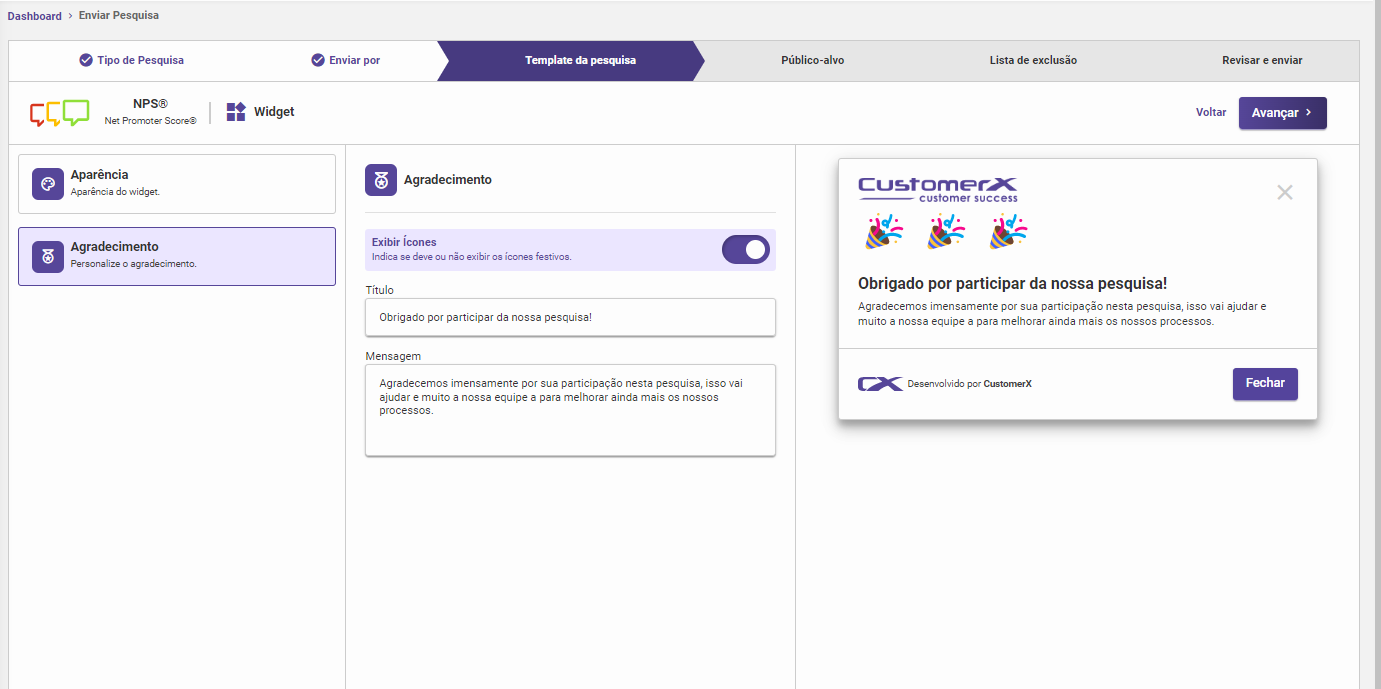 Nesta fase os clientes da CustomerX podem personalizar a pesquisa. Durante a configuração, ao lado direito da tela, temos a pré-visualização da mensagem que será exibida para o cliente final.