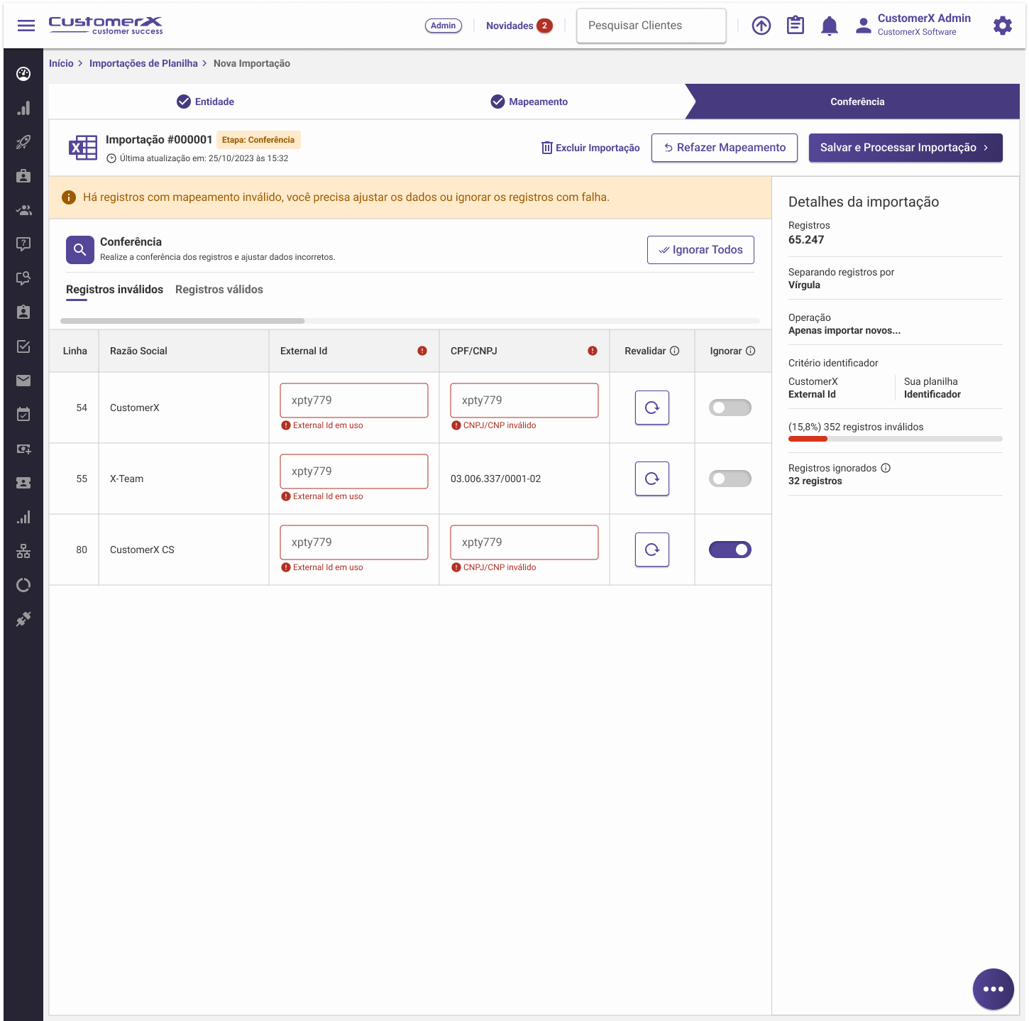 Salvar e Processar Importação: Grava as alterações feitas na conferência e inicia o processo final de importação dos dados para o CustomerX.