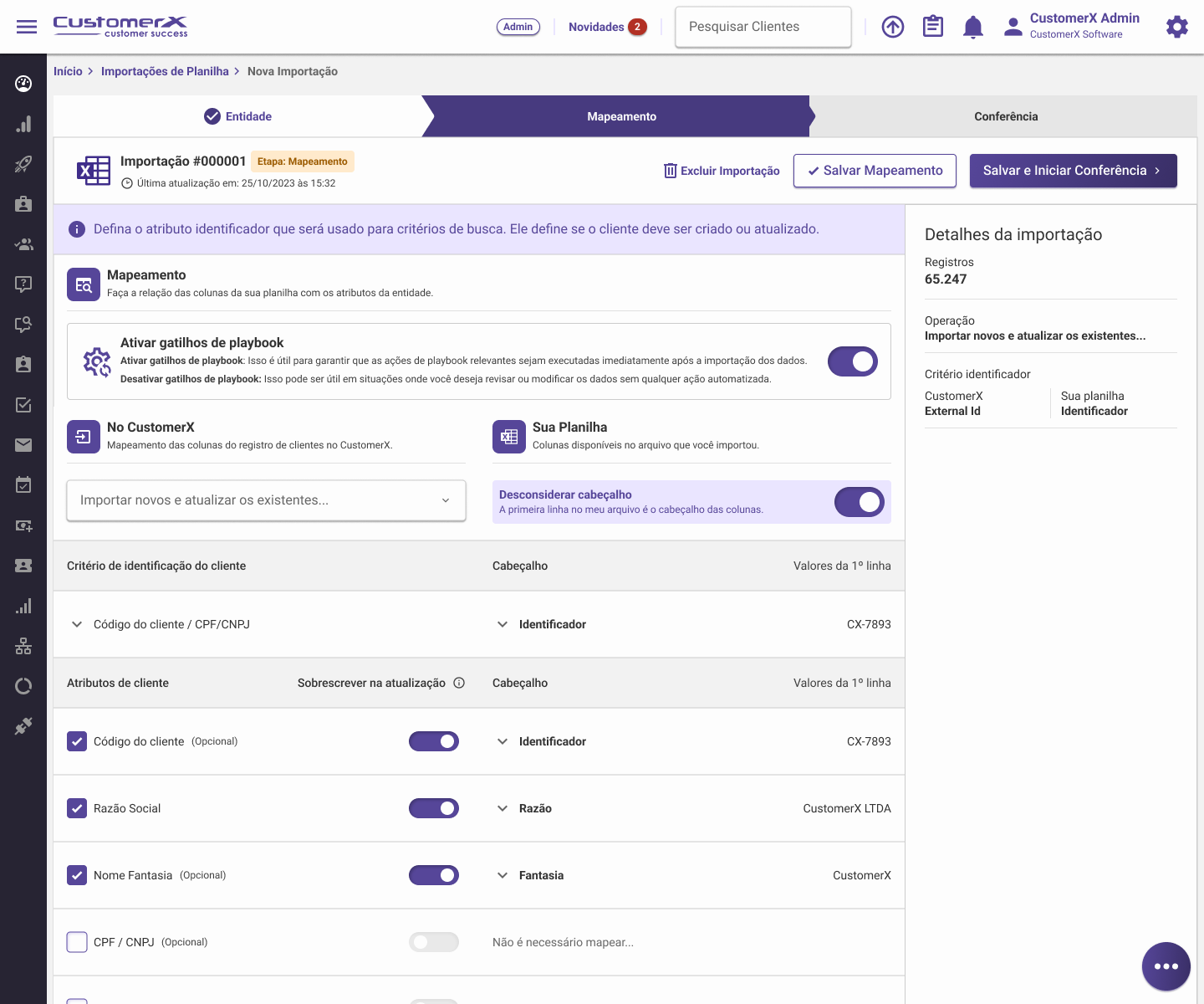 Critério Identificador: Verifique o atributo selecionado no CustomerX e a coluna correspondente na planilha que estão sendo usados como identificadores para o mapeamento.