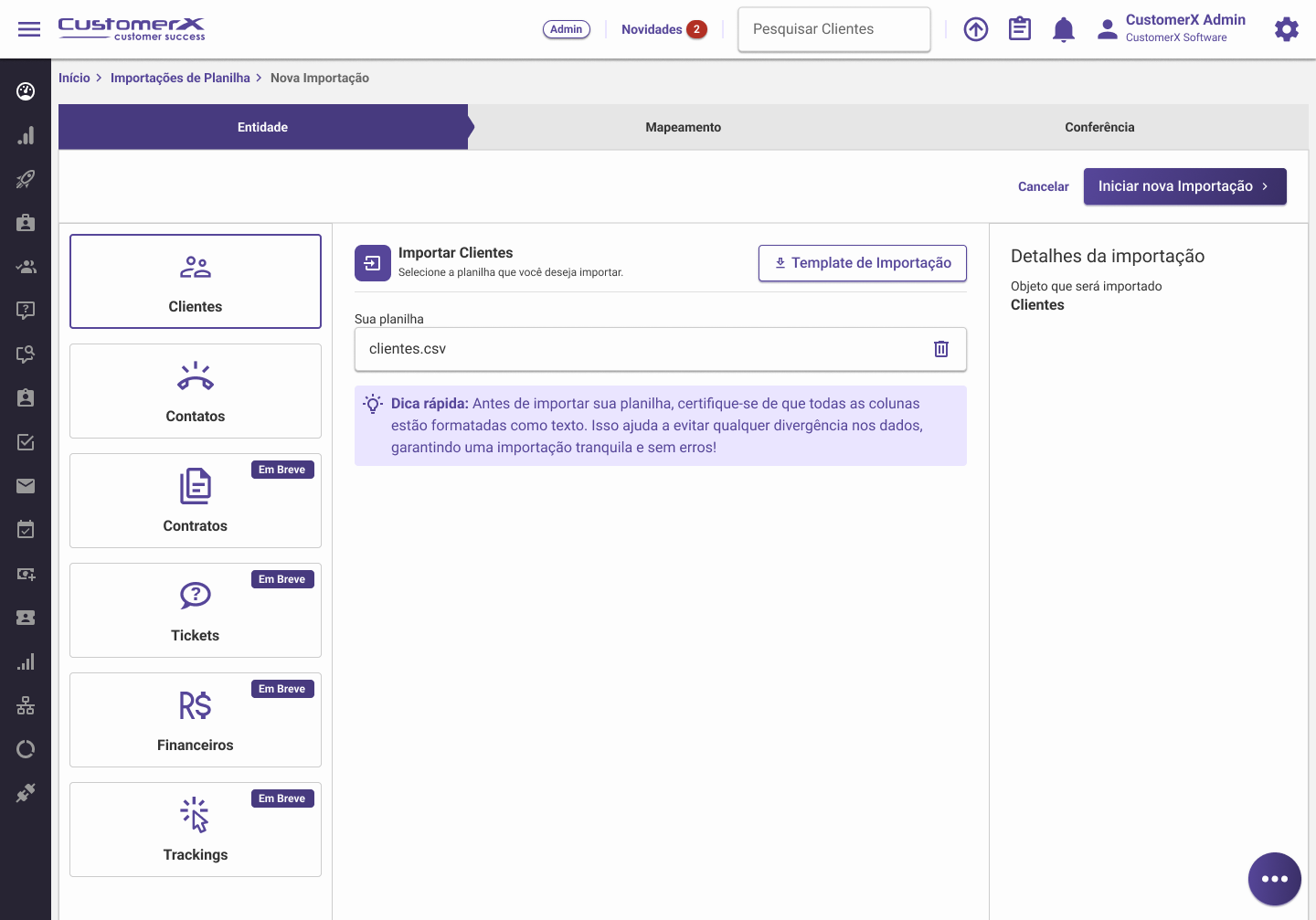 Mapeamento de Colunas: Associe cada coluna da sua planilha a um atributo correspondente no CustomerX. Por exemplo, se sua planilha tem uma coluna chamada "Nome do Cliente", você deve mapeá-la para o atributo "Nome" no CustomerX.