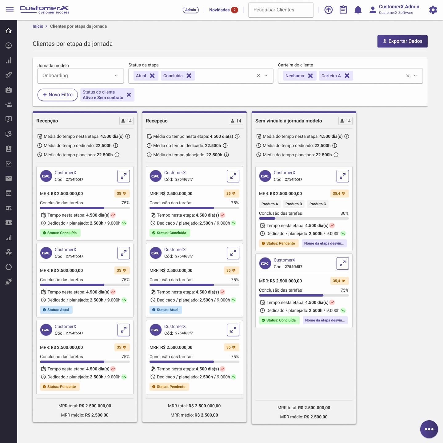 MRR Total na Etapa: Soma do MRR dos clientes presentes na etapa.