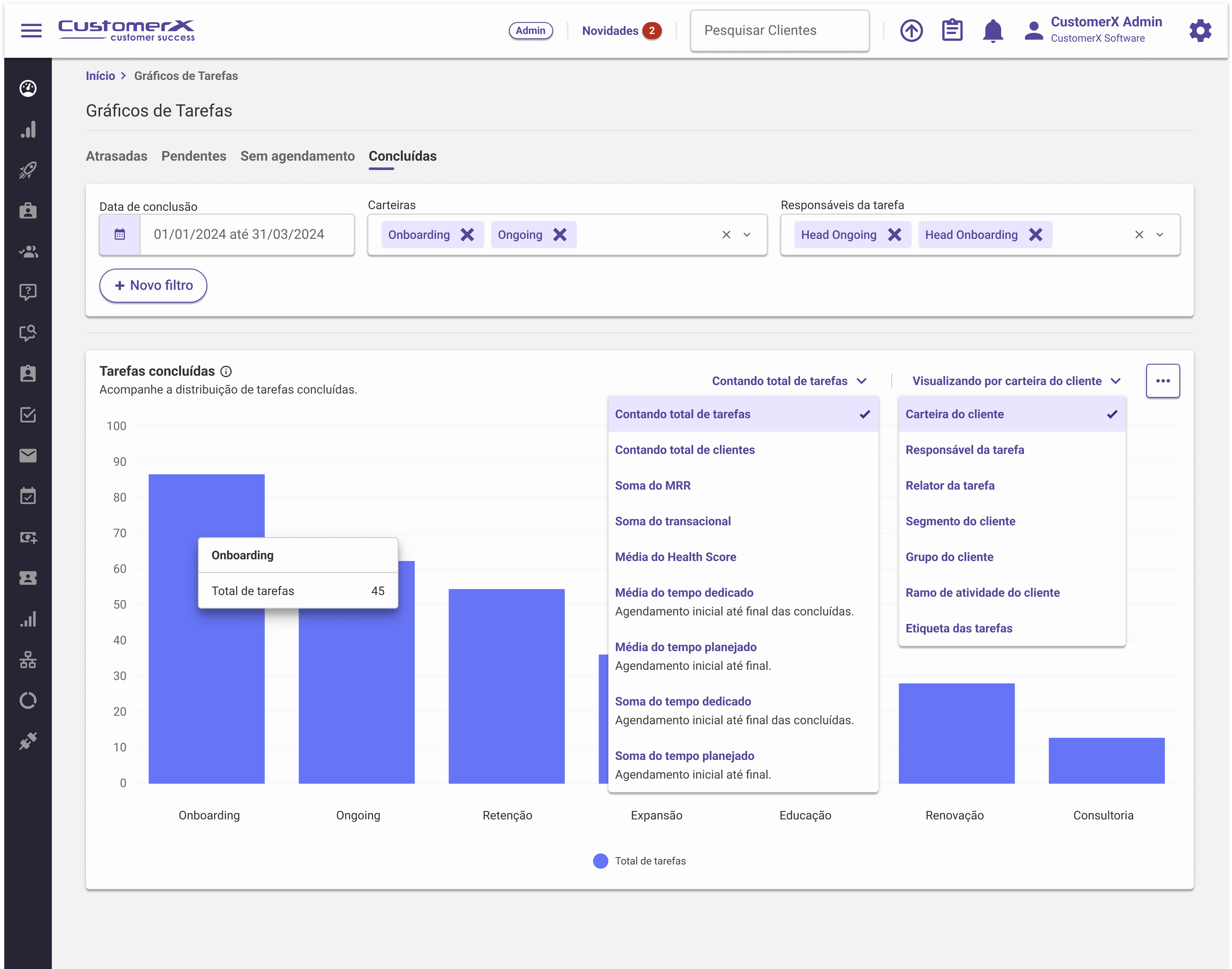 Carteira do Cliente (Padrão): Agrupa as tarefas de acordo com as carteiras de clientes. Útil para analisar o desempenho por diferentes grupos de clientes.