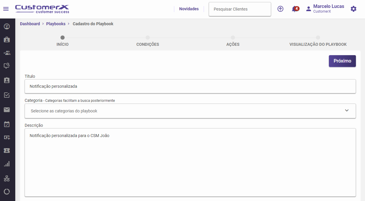 Dentro do CustomerX, no menu lateral esquerdo, acesse a opção "Playbooks" e em seguida clique no botão "Novo Playbook".
