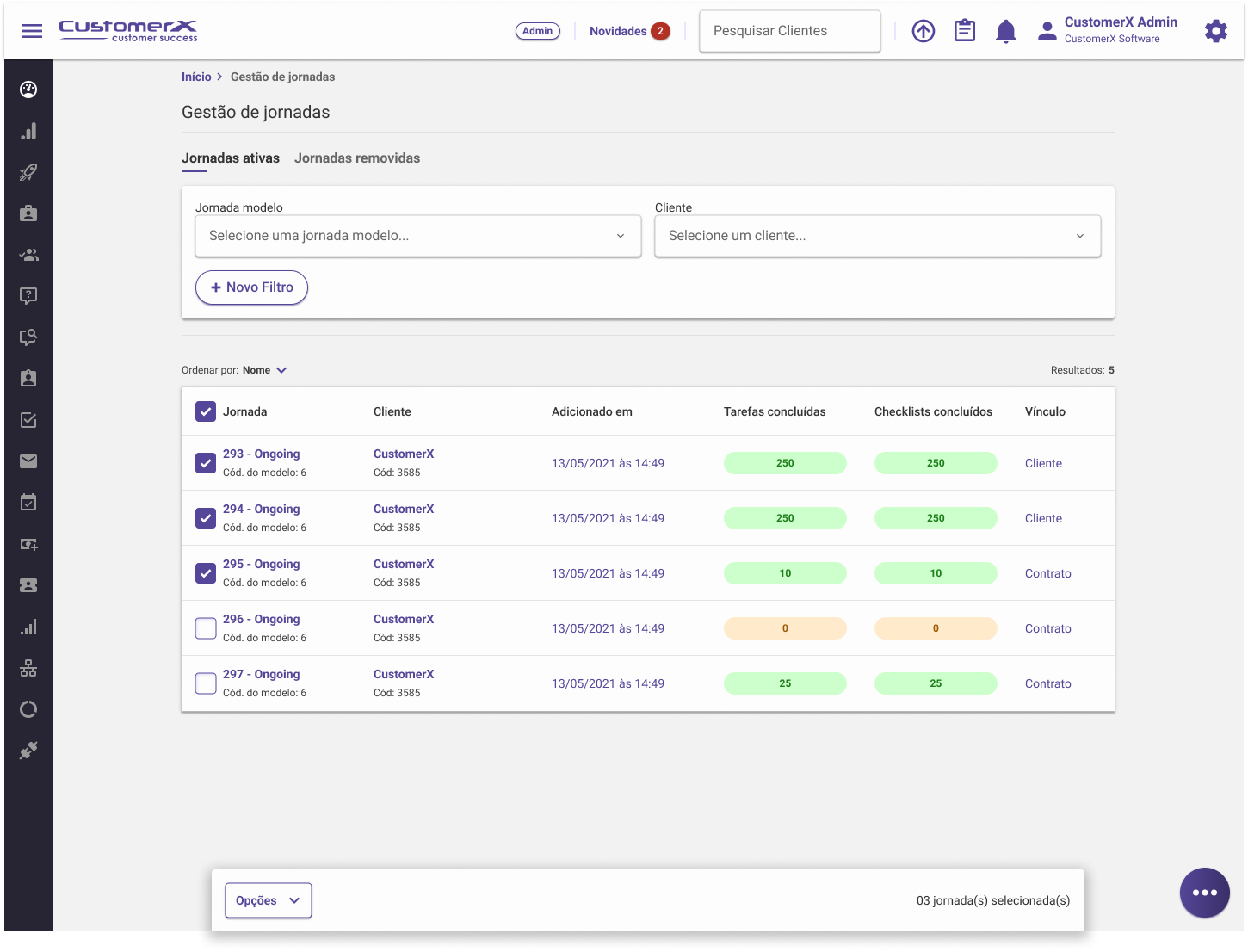 Ações em massa: Permite a remoção de várias jornadas simultaneamente, com uma notificação de confirmação antes da execução.