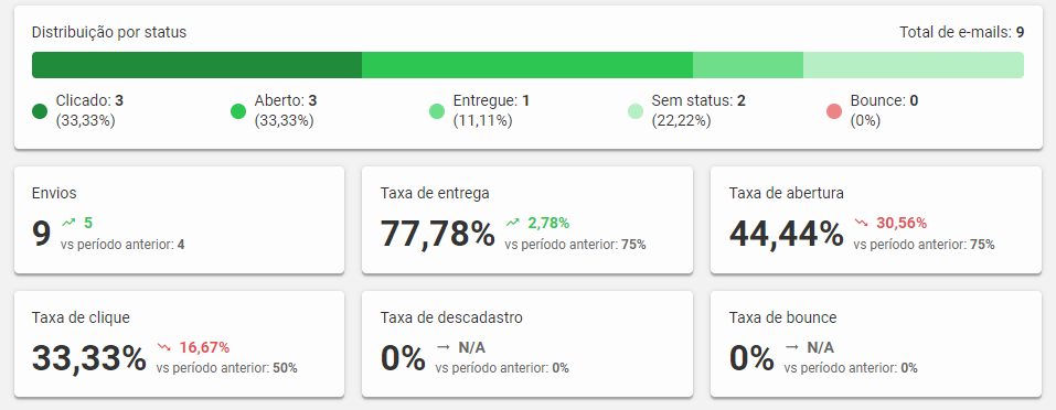 Sem status: Este indicador abrange o número total de envios que não possuem um status atribuído e o percentual em relação ao total de envios efetuados.