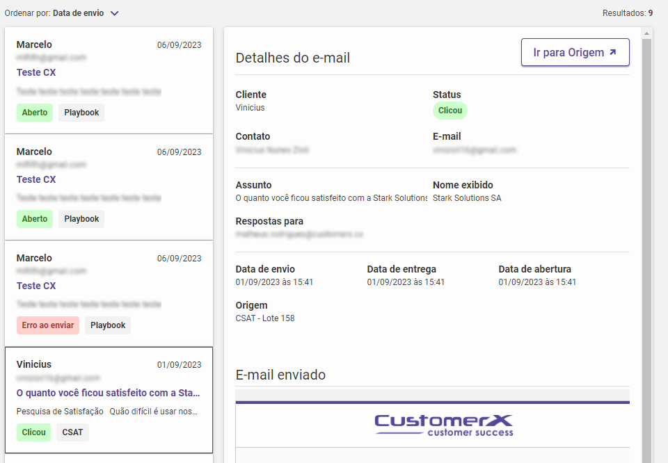 Nesta seção, você poderá visualizar a lista de e-mails enviados pelo CustomerX, além de ter acesso ao conteúdo de cada e-mail, seu status e origem.