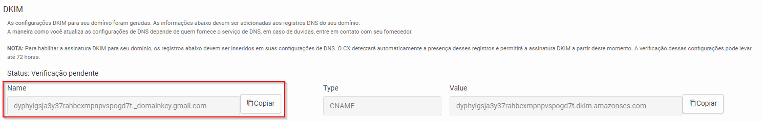 Agora você irá adicionar os três registros CNAME gerados no CustomerX para apontar para os locais de autenticação do DKIM.