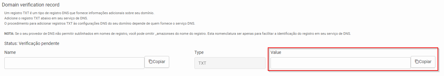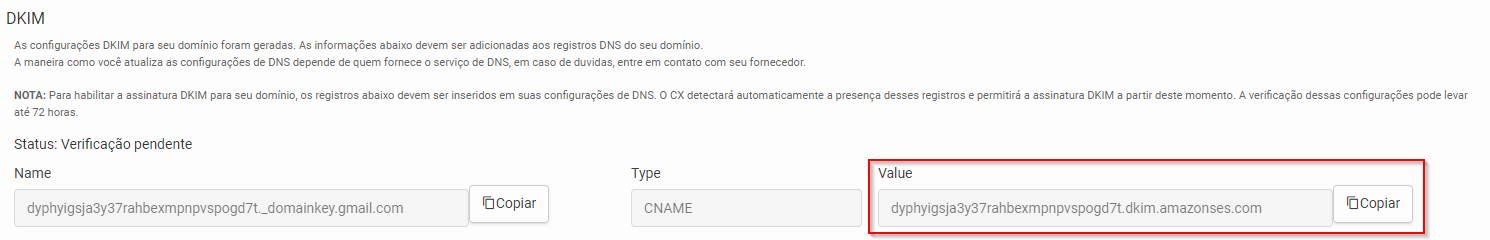 No valor do registro TXT, você precisará inserir a chave fornecida no CustomerX, presente no campo "Value".