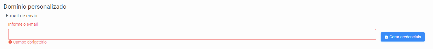 Na opção Domínio personalizado, informe o e-mail que deseja definir o remetente dos disparos no CustomerX e clique na opção "Gerar credenciais".