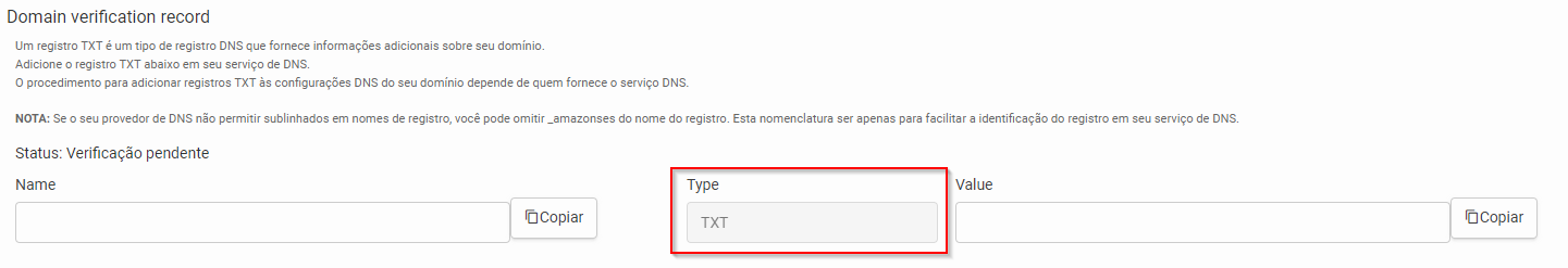 No tipo, escolha a opção TXT, conforme fornecido no campo "Type" da credencial.