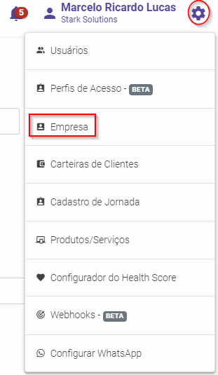 Acesse as configurações de Domínio personalizando através da engrenagem no canto superior direito e clicando na opção "Empresa".