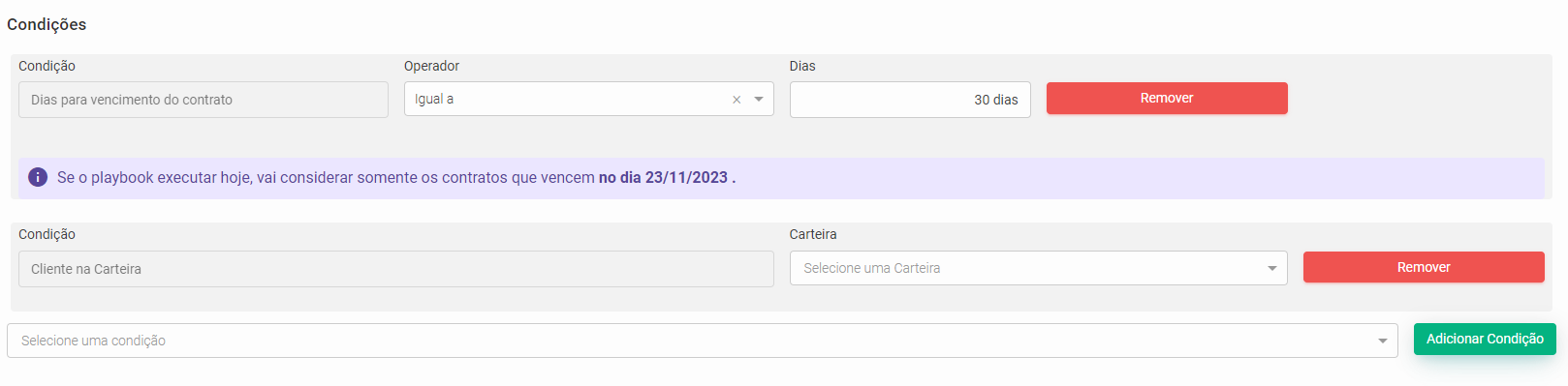 Na seção de condições, ajuste os critérios de acordo com suas necessidades. Para notificar o CSM quando um contrato estiver próximo do vencimento, use "Dias para vencimento do contrato" com o operador "Igual a" e especifique a quantidade de dias antes do vencimento.